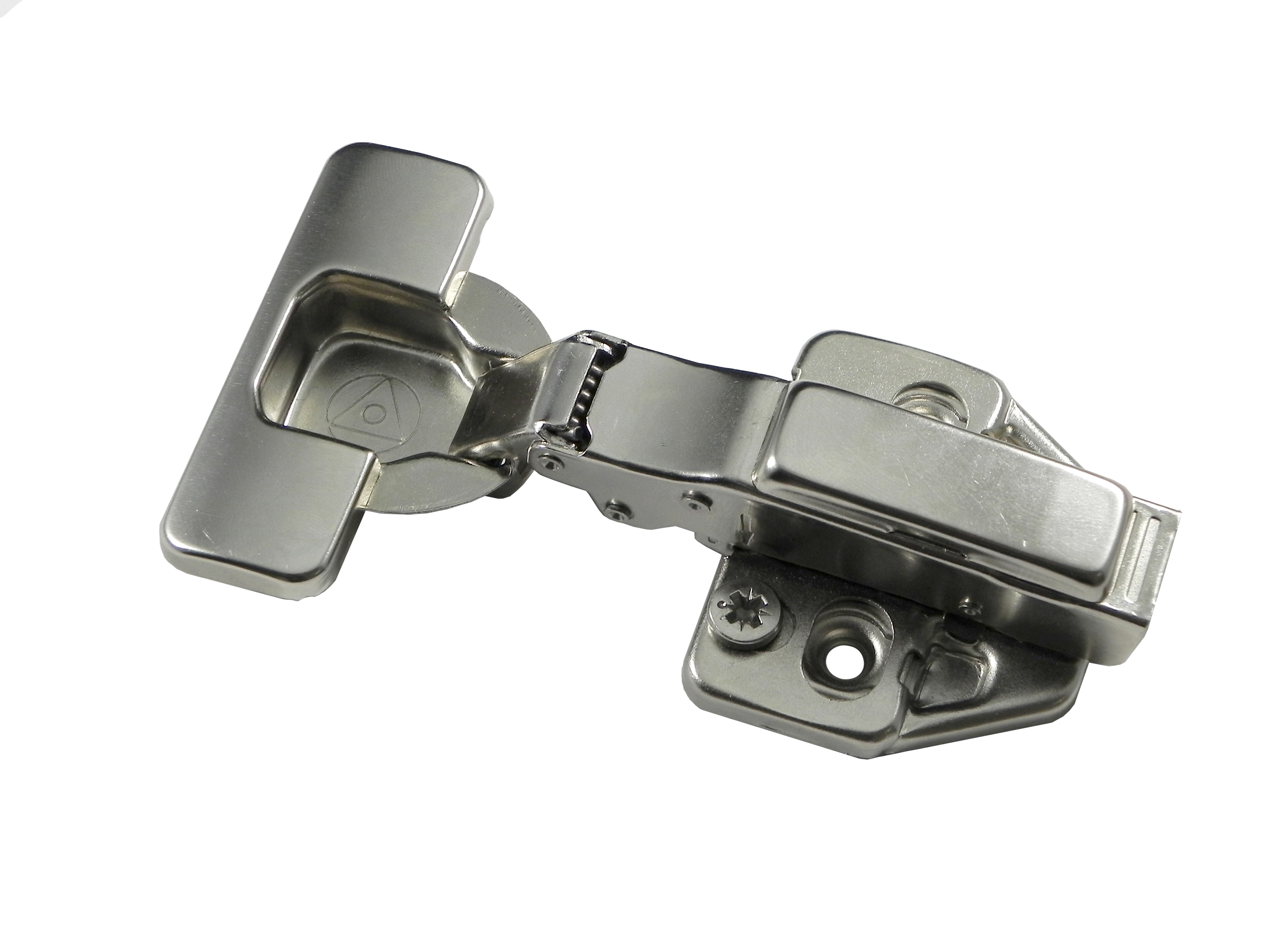 Bisagra para puertas de muebles fabricadas en madera. Su montaje es de tipo clip, con sistema doble acción, evitando que se suelten los tornillos. Posee pistó hidráulico, lo que retarda el cierre de la puerta al final de su recorrido.